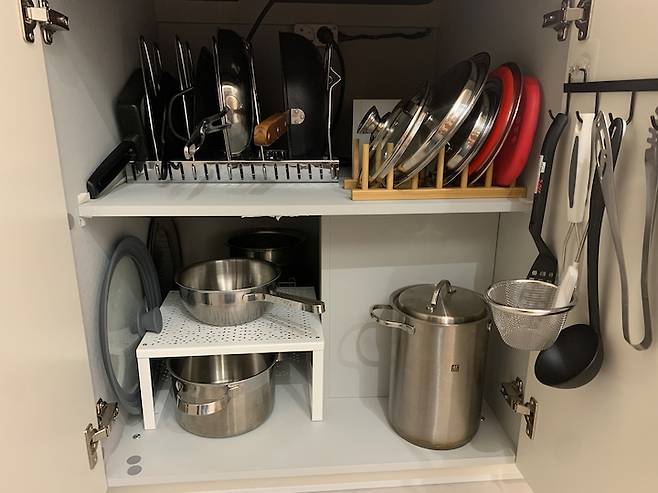 여기는 인덕션 아래 후라이팬과 냄비 등을 보관하는 하부장이에요. 후라이팬은 쌓는 대신 옆으로 세우고, 뚜껑끼리 따로 보관해서 하나씩 꺼낼 때 걸리는 것이 없도록 만들었어요. 냄비도 겹치지 않게 하나씩 선반에 자리하고 있습니다.