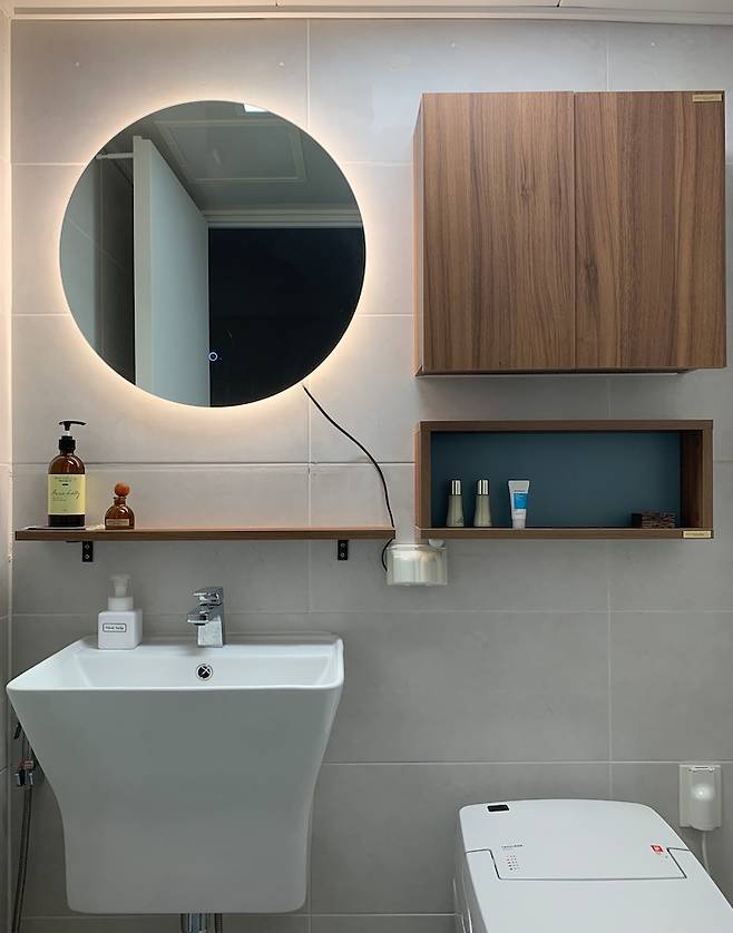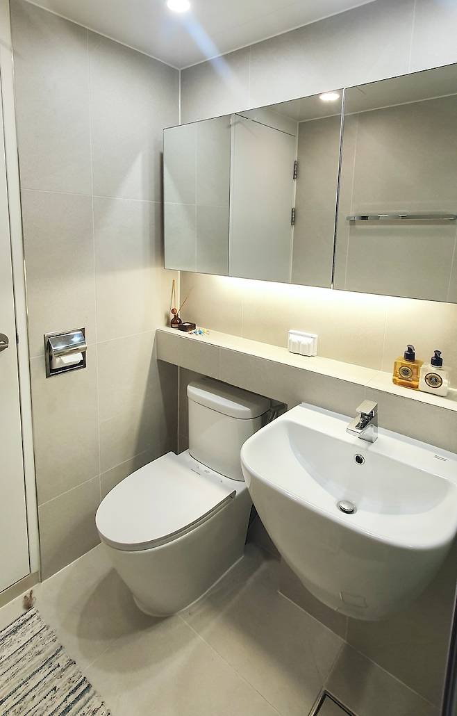 공사를 안 한 탓에 LED 거울 전선이 밖으로 보이기는 하지만, 켜두면 너무 예뻐요. 팁을 드리자면 저희는 거실/안방 화장실 모두 센서등을 설치해서 잠깐 손 씻으러 들어갈 때 불을 굳이 켜지 않아도 되게 만들었어요. 사소하지만 편리해서 고려해 볼만한 아이템인 것 같아요.