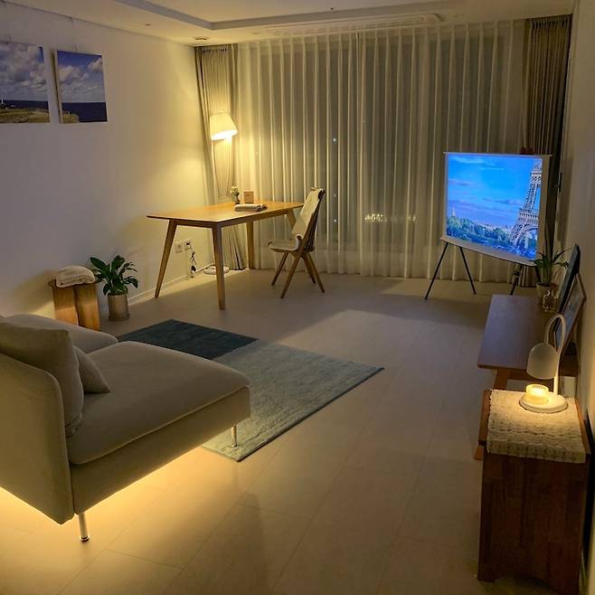 소파 아래 조명과 스탠드 조명은 필립스 휴 제품으로 스마트 조명입니다. 조도와 색상 조정은 물론, 음악에 맞춘 색상변화도 가능해서 여러 분위기를 낼 수 있습니다. 저희는 저녁에 주로 간접등을 애용하는데, 특히 소파 아래 간접조명이 고급스럽고 은은한 분위기를 내줘요. 인테리어의 완성은 역시 조명인 것 같아요.