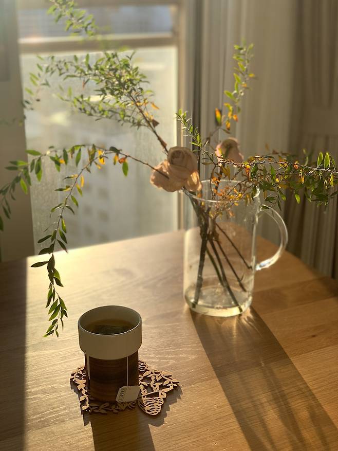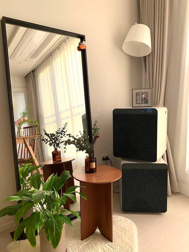 좋아하는 전신거울을 거실로 옮겨 만든 공간입니다. 식탁 옆에 거울을 두니 왠지 카페 분위기가 나서 좋더라구요. 둘이 함께 거실에서 보내는 시간이 가장 많은 만큼 이것저것 자꾸 변화를 주는 게 소소한 행복입니다.