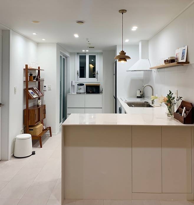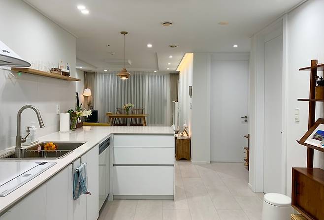 주방에서 보면 이렇게 거실과 이어지는 느낌을 줘요. 그래서인지 다들 집이 더 넓어 보인다는 말씀을 하시네요. 요리하는 걸 좋아하는데 조리공간도 넓어지고 손님이 왔을 때도 마주보고 얘기하며 요리할 수 있어서 좋습니다.