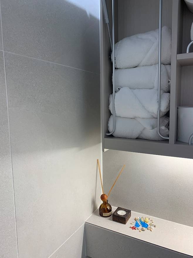 수건은 호텔 느낌 화장실에 맞게 하얗고 도톰한 수건을 새로 마련해서 쓰고 있습니다.