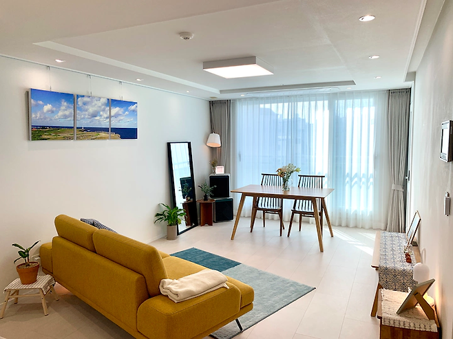 최근 소파를 바꾸고 난 뒤의 모습이에요. 비비드한 컬러의 소파에 도전해 봤는데, 걱정과 다르게 화이트 톤의 배경과 우드 가구에 정말 잘 어울리더라구요. 소파 쪽 벽에 걸린 사진은 남편이 여행가서 직접 찍은 사진입니다. 추억이 깃든 사진인 만큼 거실이 많이 바뀌어도 사진만큼은 거실을 지키고 있어요.