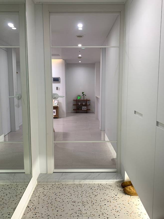 다운라이트 조명은 현관부터 복도 끝 장식선반까지 이어져서 집 전체가 넓어 보이게 했어요. 중문은 개방감 있는 제품으로 설치했더니 단절되어 보이지 않아서 좋아요. 얇은 문이지만 생각보다 방음과 방열 효과가 커서 만족해요.