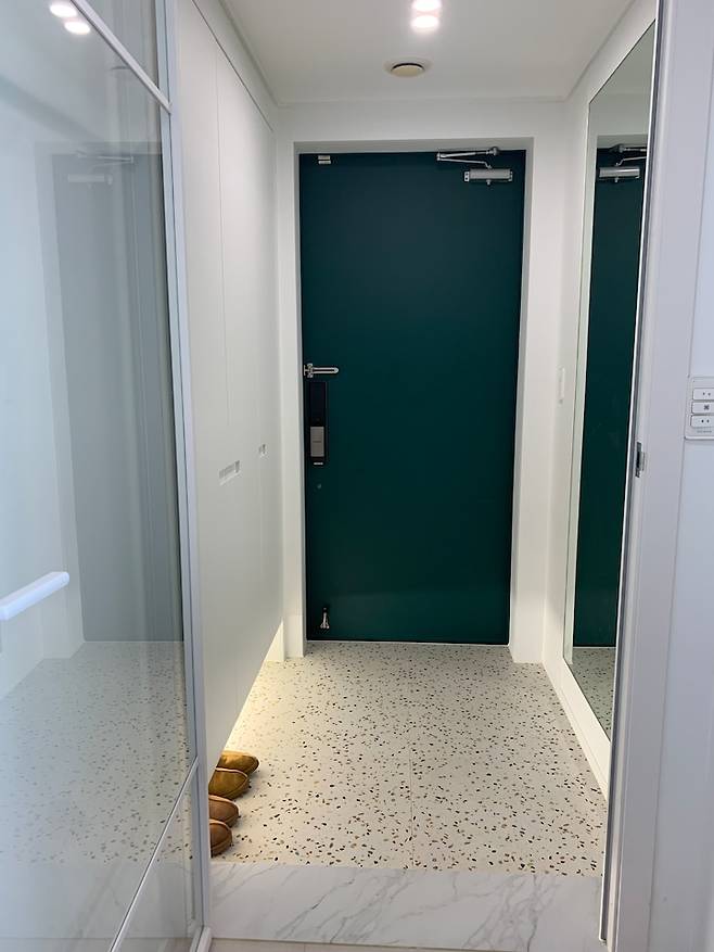 현관은 밝고 환한 느낌을 주고 싶었어요.우연히 만난 레인보우 테라조 타일이 너무 마음에 들었고, 현관문의 딥그린 필름과 잘 어울릴 것 같아 선택하게 되었습니다. 큼지막한 600각 타일을 골라 깔끔하고도 발랄하게 완성되었어요. 무난한 걸 해야 질리지 않는다고 하지만 내 눈에 예뻐 보이는 게 중요하죠~. 매일 봐도 기분이 업되는 효과가 있더라구요. 🙂