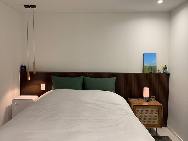 침실은 호텔처럼 포근하게 잠만 자는 곳으로 만들고 싶었어요. 기존에 쓰던 침대 프레임에 헤드가 없어서 인테리어할 때 템바보드로 침대 헤드 겸 포인트를 주었습니다. 사각 템바보드에 우드필름은 유행없이 쓸 수 있는 느낌이고, 무엇보다 소품을 올려둘 수 있는 기능도 할 수 있어서 좋아요.