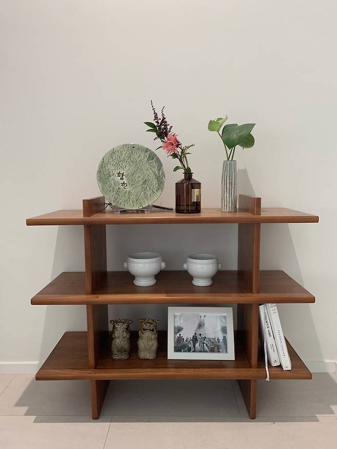 안방과 주방 사이에 복도 끝 작은 공간이 있어요. 집에 들어오자마자 정면으로 바로 보이는 공간이 이곳입니다. 집의 첫인상을 좌우하는 공간인 만큼 심플한 장식장을 두고 저희 명패도 올려 놓았어요. 나무와 도기가 주는 느낌을 좋아하는데 흰 벽 앞 이 공간에 둘의 조합이 너무 좋은 것 같아요. 바로 위에 예쁜 그림을 걸고 싶은 공간이기도 한데, 언젠가 이 공간에 꼭 맞는 작품을 만나게 되면 또 소개드릴게요. 🙂