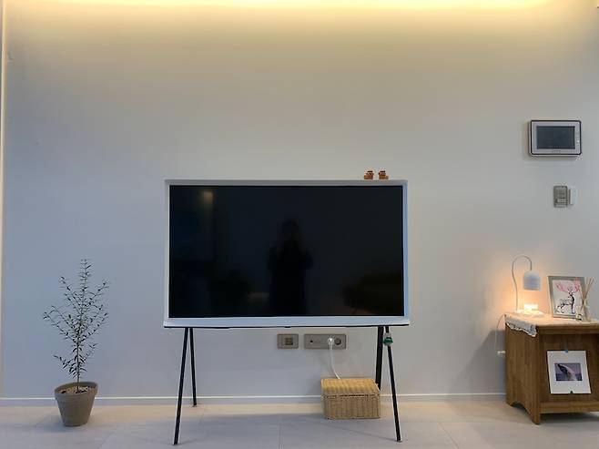 가구 배치 바꾸는 것을 좋아해서 거실에 고정된 큰 가구가 없다는 게 특징입니다. 가끔은 소파를 창가를 바라보게 세팅하기도 하고 손님 수에 맞춰 식탁 방향을 바꾸기도 해요. 붙박이 TV를 하면 이런 배치에 제한이 생기기 때문에 대신에 옮길 수 있는 세리프TV를 선택했습니다. 가구 슬라이더 제품을 다리에 붙이면 무거운 소파도 혼자서 쉽게 옮길 수 있답니다.