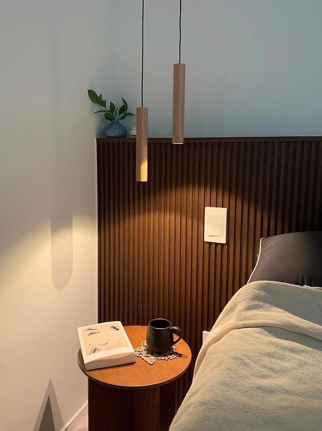 침대 옆 펜던트 조명은 예전부터 너무 갖고싶던 제품이라 침대 머리맡에 설치했어요. 헤드쪽으로 스위치까지 신설해 주니 침대에 누운 상태로 자기 전에 등을 끌 수 있는 디테일이 더욱 호텔같아요.