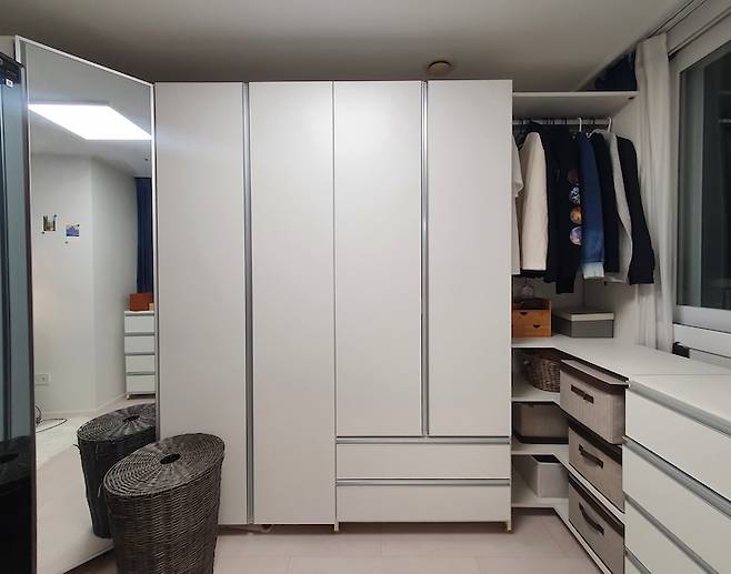 드레스룸은 옷과 화장품이 모두 모여 있는 공간입니다. 붙박이장을 맞추려다가, 창문을 가리지 않으며 구성할 수 있는 수쿠퍼니텍을 알게 돼서 설치했습니다. 조립식이고 옷장 뒷판이 없어서 공간을 덜 차지하는 면도 큰 장점이 되네요. 옷은 예쁘게 수납할 자신이 없어서 문을 달아주고 오픈형 장에는 패브릭 박스에 옷과 악세서리를 추가로 보관하고 있어요.