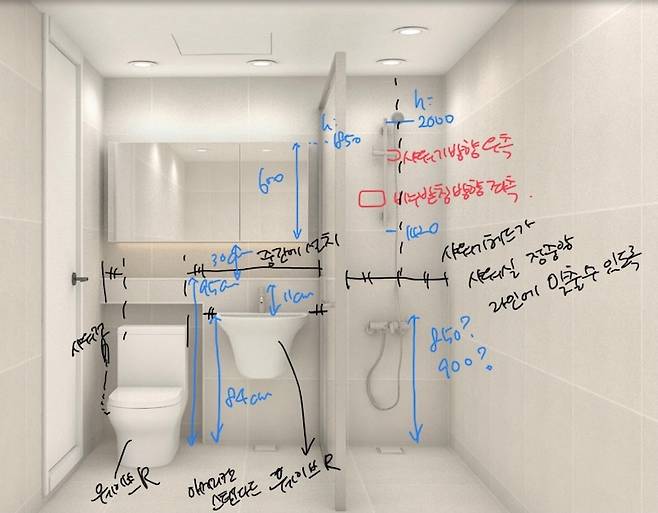 그래서 저희는 위 그림처럼 주방 선반, 펜던트등, 젠다이 높이, 도기 세팅, 수전 높이까지 하나하나 센티미터 단위로 그려서 드렸고, 그대로 작업해 주셔서 원하는 결과를 얻을 수 있었어요. 셀프 인테리어 하시는 분들의 수고에는 못미치지만, 턴키 인테리어도 거의 매일 현장을 확인하는 등 많은 노력이 들어가야 후회 없다는 것을 말씀드리고 싶어요. 🙂