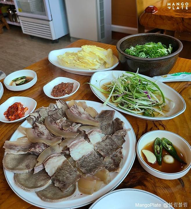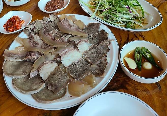 한우접시수육도 이곳의 대표적인 메뉴입니다. 큰 접시에 큼직하게 썬 수육이 푸짐하게 담겨져 나오죠. 양도 양이지만, 부들부들하면서도 야들야들한 식감이 최고!