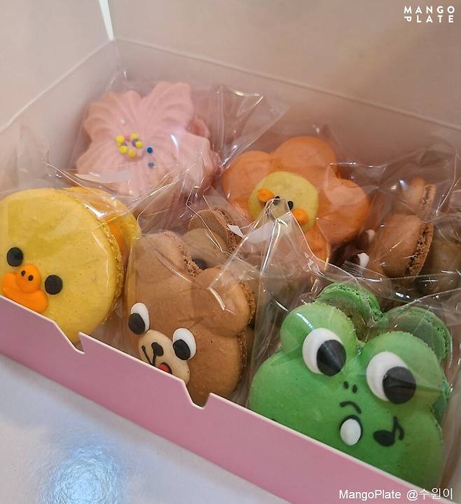 매장에서 눈에 띄는 곳이 있는데요. 바로 귀염뽀짝 마카롱이 진열되어있는 쇼케이스 입니다. 보자마자 구매로 이어질 수밖에 없게 만드는 귀여운 비주얼이 인상적이에요. 게다가 가격까지 착한 편이니 춘천 여행 기념품으로 구매하기에도 딱!