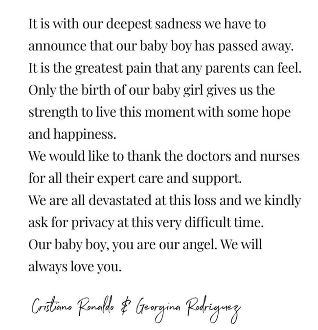 호날두는 공식 SNS를 통해 “우리 아이가 세상을 떠났다는 소식을 전하게 돼 깊은 슬픔이 밀려온다. 모든 부모가 느낄 수 있는 가장 큰 고통이다. 아기의 탄생은 우리에게 희망과 행복을 전해주고, 지금 이 순간을 살아갈 힘을 준다. 많은 보살핌과 의료적인 지원을 해준 의료진과 간호사들에게 감사하다. 매우 절망스러운 이 시기에 사람들이 우리의 프라이버시를 존중해주기를 요청한다”고 전했다.
