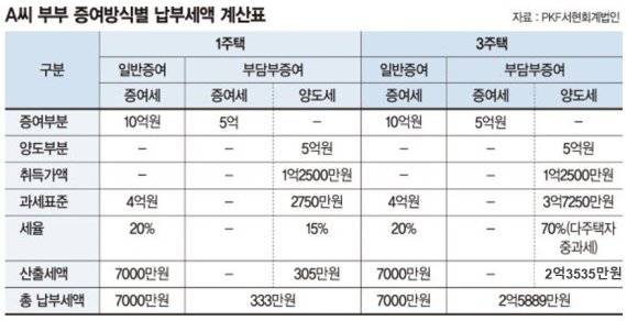 일반증여, 부담부증여 선택 시에는 △증여자의 보유주택 수 △1세대 1주택 비과세 여부 △증여자의 취득가액 등에 따라 유불리가 달라진다. A씨 사례처럼 최종 납부 세액 차이가 수십배 날 수 있기 때문에 해당 사항들을 사전에 꼼꼼하게 확인해야 한다는 게 서현회계법인 관계자 당부다.