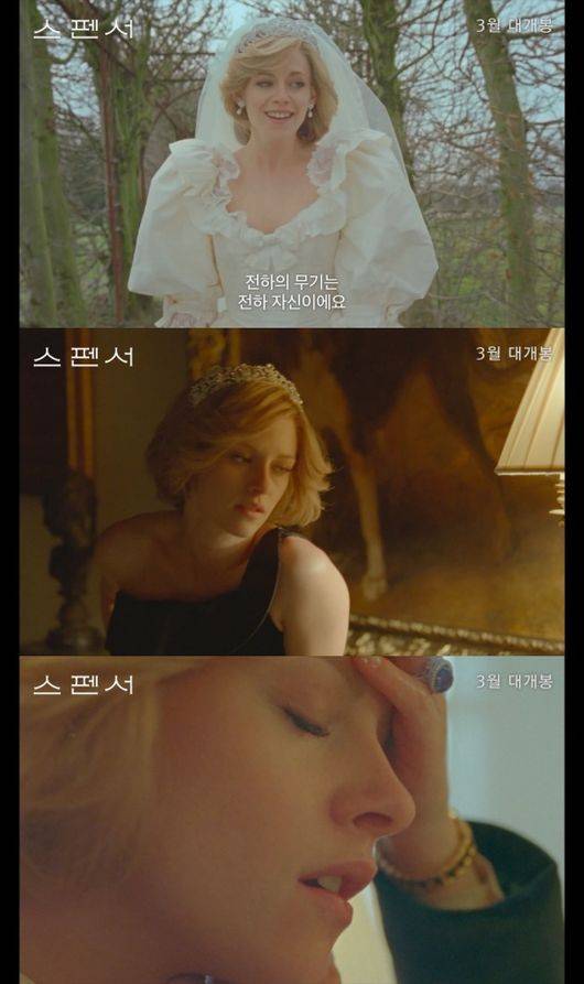 공개된 '스펜서' 메인 예고편은 크리스마스 연휴를 보내기 위해 엘리자베스 여왕, 필립공 그리고 이들의 강아지까지 왕실 가족이 차례로 샌드링엄 별장에 도착하는 장면으로 시작된다. 이와 동시에 별장을 책임지는 그레고리 소령 역의 티모시 스폴이 아직 도착하지 않고 있는 다이애나 왕세자비를 기다리고, 이내 크리스틴 스튜어트가 등장한다. 이어 2022년 제94회 아카데미 시상식 여우주연상 후보, 전 세계 26개 여우주연상 수상 카피는 다이애나 왕세자비로 변신한 크리스틴 스튜어트의 연기와 변신에 기대감을 높인다.