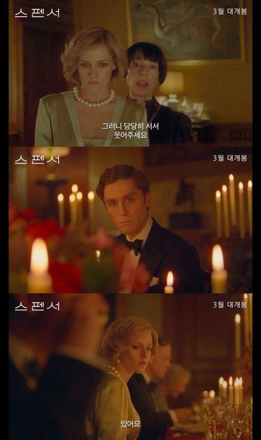 이어 자신이 좋아하는 것은 “평범하고 실재하는 것들이죠”, “이곳에는 희망이 없어요”라고 말하는 다이애나와 그에게 “맞서 싸워요. 전하의 무기는 전하 자신이에요”라며 용기를 주는 매기의 대사가 메인 예고편의 클라이맥스를 장식한다. 특히 뜯겨 떨어지는 진주 목걸이와 힘차게 달려 나가는 다이애나의 어린 시절 모습, 그리고 왕세자비의 모습은 전 세계가 극찬한 '스펜서'에 대한 기대감을 고조시키며 관람 욕구를 자극한다.