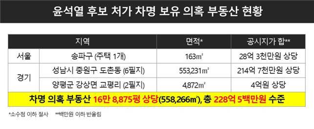 "일가 소유 토지만 합해도 미니 신도시 규모"라고 지적한 민주당은 "윤 후보의 부동산 보유세 완화 공약이 처가를 지키기 위한 것이 아닌지 검증해야 한다"고 강조했다.