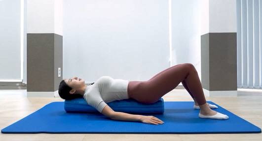 폼롤러를 매트에 세로로 놓은 후 끝 기둥에 골반을 대고 앉는다. 양발을 골반 너비로 벌려준 뒤, 몸을 천천히 뒤로 젖혀 폼롤러에 등을 대고 눕는다. 누웠을 때 턱이 위로 들리지 않도록 주의한다. 허리 뒤와 목 뒤쪽 공간은 손 한 뼘 정도로 유지한다.