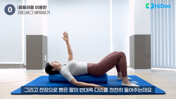 폼롤러를 활용한 데드버그 운동은 맨몸 운동처럼 양쪽을 번갈아가며 진행하지 않는다.