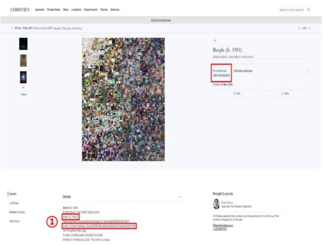 “먼저 이 작품을 사려는 사람은 온라인 크리스티 경매 사이트(www.christies.com)에서 해당 작품을 찾아야 한다. 그러면 거기에서 이 작품의 이름과 소유권 양도 내역 등이 간략히 기록되어 있는 블록체인 상의 주소, 즉 ‘NFT 스마트 컨트랙트’를 확인할 수 있다. 그러면 이 주소를 복사한 뒤 블록체인 망에 접속해야 한다. 예를 들어 이더리움 블록체인이라면 이더스캔(Etherscan) 사이트에 접속해 복사한 주소를 넣은 뒤 몇차례 단계를 거치면 작품에 대한 보다 상세한 정보를 담고 있는 사이트, 즉 ‘NFT 메타데이터’의 주소를 알려준다. 이 NFT 메타데이터는 블록체인이 아니라 외부의 다른 분산 저장 매체에 저장된다.