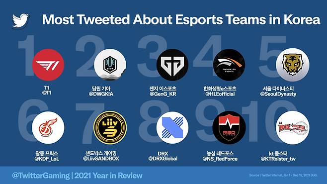 트위터를 통해 글로벌 팬과 활발히 소통하고 있는 국내 e스포츠팀 순위도 공개됐다. ‘2021 국내에서 가장 많이 언급된 e스포츠팀’ 1위는 SK 텔레콤의 e스포츠팀 ‘T1(@T1)’이 차지했다.