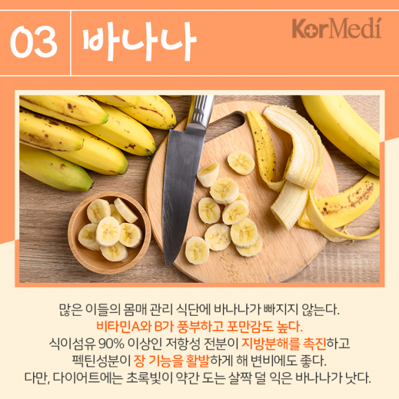 바나나 : 많은 이들의 몸매 관리 식단에 바나나가 빠지지 않는다. 비타민A와 B가 풍부하고 포만감도 높다. 식이섬유 90% 이상인 저항성 전분이 지방분해를 촉진하고 펙틴성분이 장 기능을 활발하게 해 변비에도 좋다. 다만, 다이어트에는 초록빛이 약간 도는 살짝 덜 익은 바나나가 낫다.
