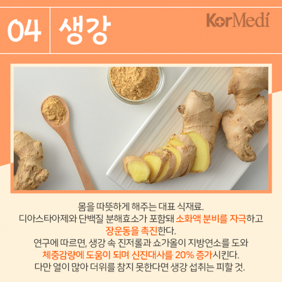 생강 : 몸을 따뜻하게 해주는 대표 식재료. 디아스타아제와 단백질 분해효소가 포함돼 소화액 분비를 자극하고 장운동을 촉진한다. 연구에 따르면, 생강 속 진저롤과 쇼가올이 지방연소를 도와 체중감량에 도움이 되며 신진대사를 20% 증가시킨다. 다만 열이 많아 더위를 참지 못한다면 생강 섭취는 피할 것.