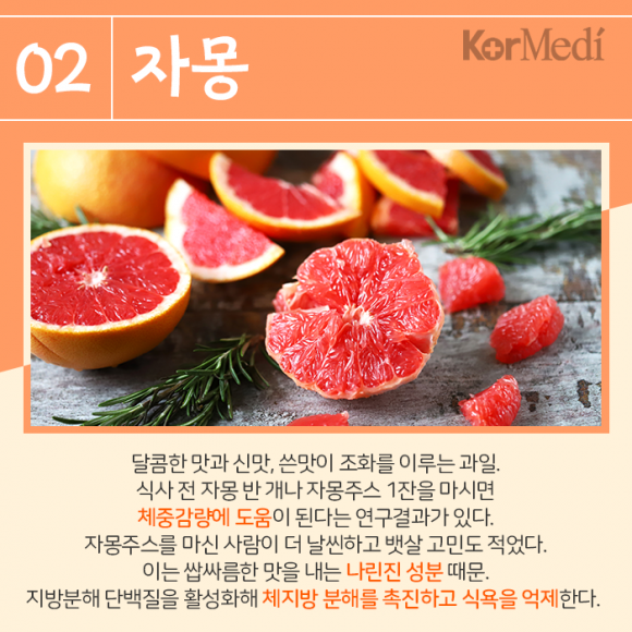 자몽 : 달콤한 맛과 신맛, 쓴맛이 조화를 이루는 과일. 식사 전 자몽 반 개나 자몽주스 1잔을 마시면 체중감량에 도움이 된다는 연구결과가 있다. 자몽주스를 마신 사람이 더 날씬하고 뱃살 고민도 적었다. 이는 쌉싸름한 맛을 내는 나린진 성분 때문. 지방분해 단백질을 활성화해 체지방 분해를 촉진하고 식욕을 억제한다.