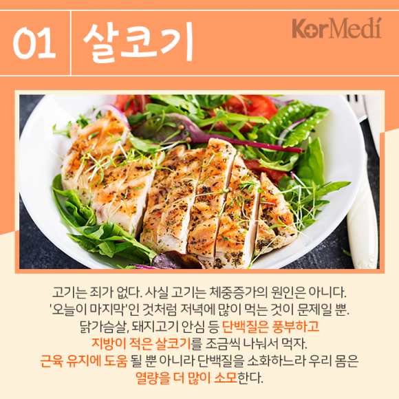 살코기: 고기는 죄가 없다. 사실 고기는 체중증가의 원인은 아니다. '오늘이 마지막'인 것처럼 저녁에 많이 먹는 것이 문제일 뿐. 닭가슴살, 돼지고기 안심 등 단백질은 풍부하고 지방이 적은 살코기를 조금씩 나눠서 먹자. 근육 유지에 도움 될 뿐 아니라 단백질을 소화하느라 우리 몸은 열량을 더 많이 소모한다.