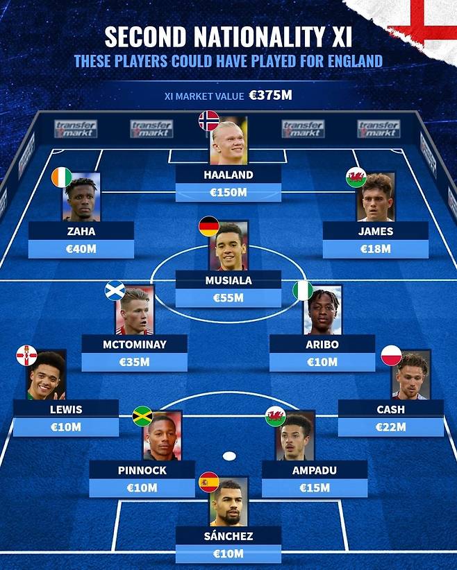유럽 축구 통계 매체 ‘트랜스퍼마크트’는 지난 21일(현지시간) 잉글랜드를 이중국적으로 가진 선수들을 중심으로 베스트 11 꾸려봤다.