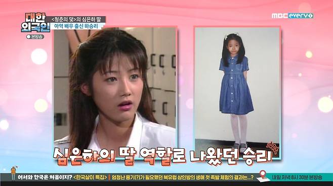 하승리는 시청률 53.1%를 기록한 드라마 ‘청춘의 덫’에서 심은하의 딸로 출연했던 아역배우 출신이다.