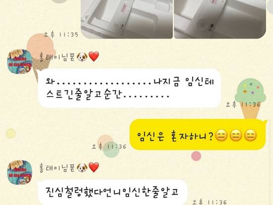 지인과의 톡 내용도 공개했다. 지인은 "임신테스트기인 줄 알고 순간"이라며 놀랐다. 김하영은 "임신은 혼자 하니?"라고 답했다.