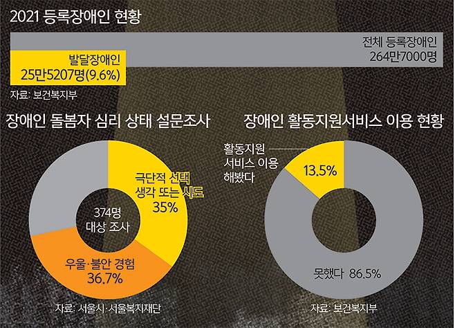 서울에 거주하는 40대 이모씨는 중증 발달장애인 아들을 키우며 우울증을 앓고 있다. 둘째 아들이 20개월이 지나도 잘 걷지 못해 대학병원을 찾아갔다가 발달장애라는 청천벽력 같은 진단을 들었다. 이씨의 아들은 7세가 됐는데도 발음이 불안정하고, 숫자를 세지 못한다. 근육 발달이 더뎌 잘 걷지도 못한다. 아이가 나아지기를 바라며 여러 치료를 이어오고 있지만, 정작 자신을 돌보지 못했다. 우울증이 생기면서 남편과 갈등도 잦아졌고, 결국 이혼까지 했다.