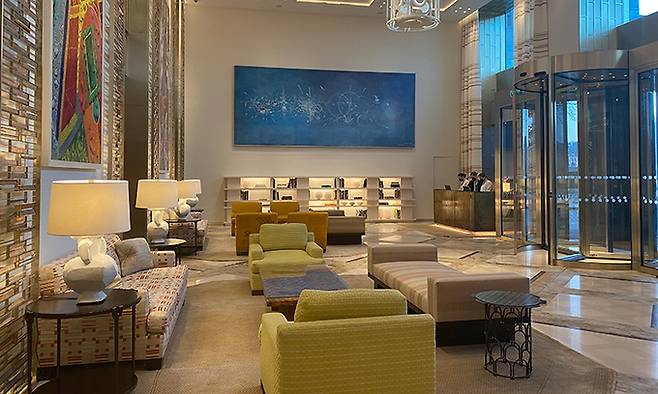 체크인을 마치고 객실로 향한다. 복도와 엘리베이터까지 화려하기 그지없다. 객실 인테리어마저 순간 부담스럽게 다가온다. 저 멋진 송치가죽 소파는 인테리어 소품이 아닌 가구겠지. 어색하게 앉아 잠시 숨을 고른다.