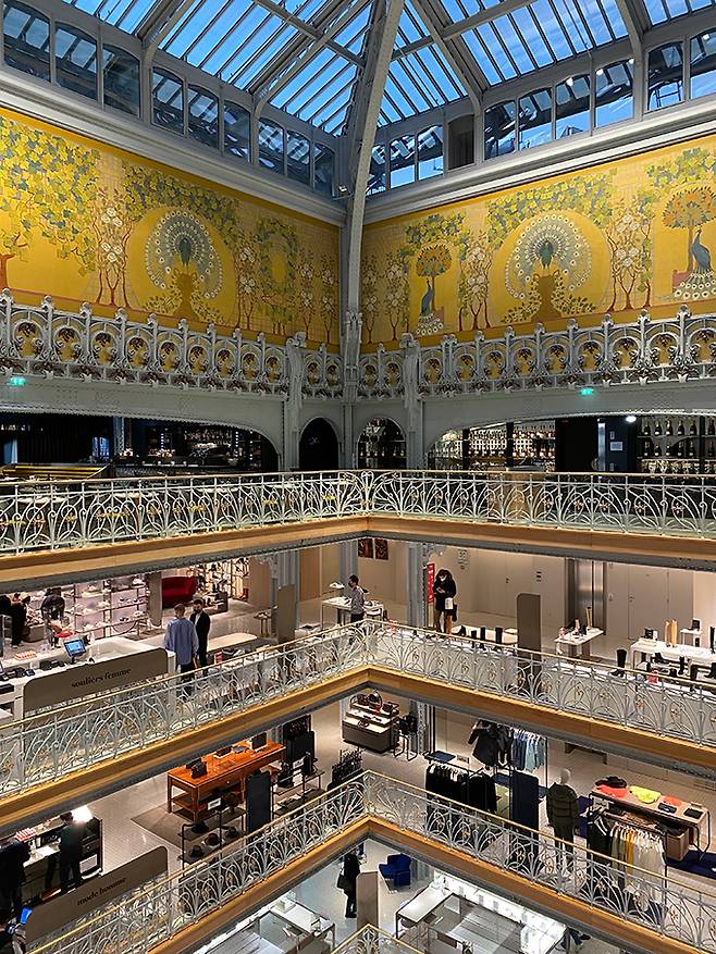 짐을 대충 정리하고 직원 인사를 받으며 호텔을 나선다. 벌써 이름을 외웠는지 ‘본 주르네, 마담 박!(Bonne journee, Mme Park!)’이란다. 어색한 웃음으로 답하고 모퉁이를 돌아 백화점으로 들어섰다. 아르누보의 명작으로 꼽힌다는 공작새 프레스코, 아르누보 파사드를 보기 위해 고개를 젖힌다. 유리 천장에서 비추는 햇살과 에펠 구조물이 시선을 이끈다. 진열된 상품 위치부터 계단까지 모두 세심하다. 쇼핑을 위한 공간이라기보다 공간 자체가 예술품처럼 느껴진다. 19세기 아르누보 양식이라는 색상들과 곡선, 형태를 강조한 다양한 장식과 20세기 아르데코 양식이 혼합된 건축물을 넋 놓고 둘러본다. 금빛 바탕에 화려한 꽃무늬 장식을 사진에 담고 움직이는 사람들을 관찰하니 마치 미디어 아트를 감상하는 듯하다.