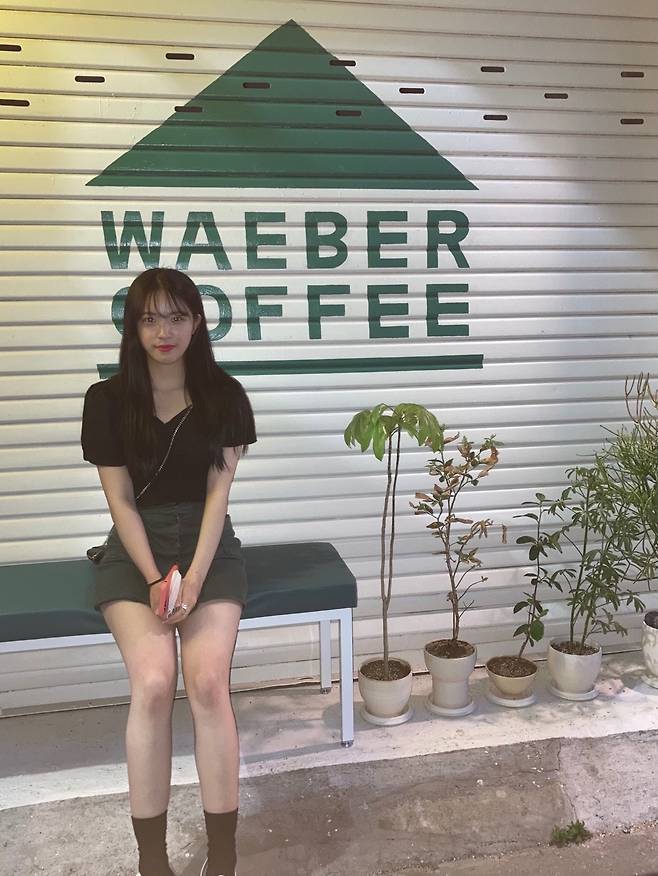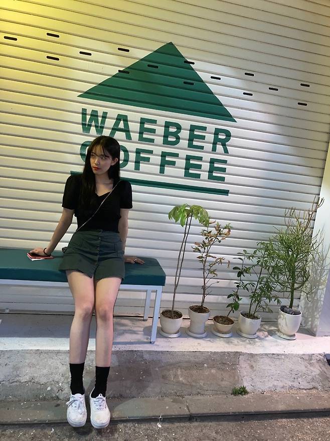 이번 코디는 카키색에 가까운 초록계열의 짧은 치마를 입었고