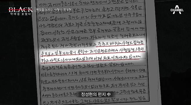 5월 20일 방송된 채널A 범죄다큐스릴러 <블랙: 악마를 보았다>(아래 블랙)에서는 2007년에 발생한 '안양 초등생 유인 살해사건'을 조명했다. <블랙> 제작진은 2021년 가을, 방영을 아직 준비하던 시점부터 한 사형수로부터 무려 편지를 9통이나 받았다. 편지의 주인공 정성현은 2007년 12월 25일 크리스마스 초등학생인 고 이혜진과 우예슬양을 납치살해한 진범이었다.