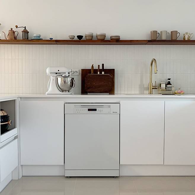 주방에서 또 하나 강조하고 싶은 요소는 골드 수전과 골드 싱크볼이에요. 그동안 로망이었는데 이번 기회에 실현할 수 있었거든요. 지금껏 모은 베이킹 도구하고도 잘 어울려 기분이 좋아요.