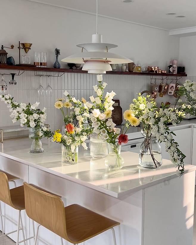 봄과 여름엔 활짝 핀 꽃을 한가득 채워요. 꽃의 섬세함이 주방의 화사함과 잘 어울리지 않나요?