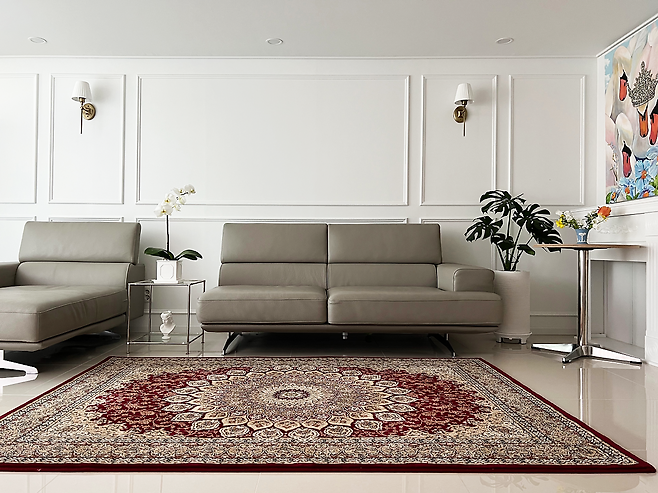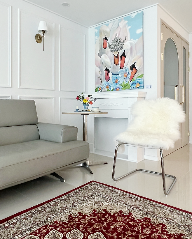 여긴 더 본격적인 '프렌치 무드'가 시작되는 공간이에요. 벽면 전체에 웨인스코팅 시공을 해서 유럽풍 무드가 나죠. 그 분위기를 더 살리려면 클래식하거나 앤틱한 가구를 선택하는 것도 좋았겠지만 저희는 심플한 가구를 들였어요. 너무 컨셉을 과하게 따르면 이내 살다가 질려버리더라고요. 대신 쉽게 바꾸어줄 수 있는 고풍스러운 러그와 그림으로 프렌치 감성을 살렸어요.