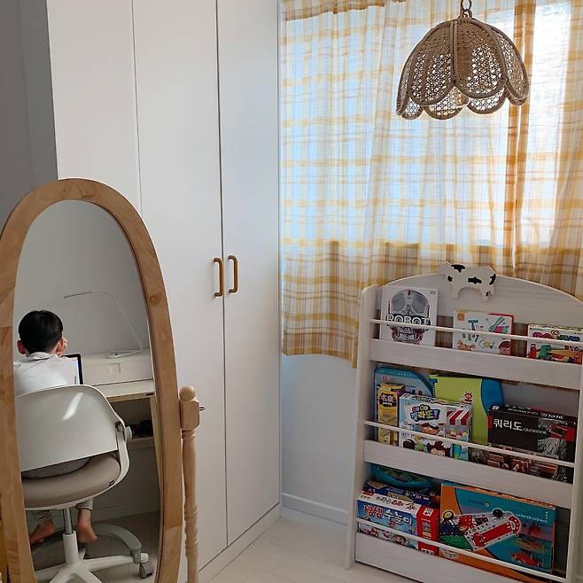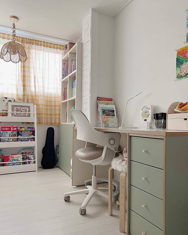 아이 방은 오로지 아이의 취향에 맞췄어요. 여러 색감의 인테리어 사진을 보여주며 "어떤 방이었으면 좋겠어?" 하고 묻기도 했죠. 그렇게 난생처음, 수면 독립에 성공한 초등학생 어린이의 방이 완성됐어요.