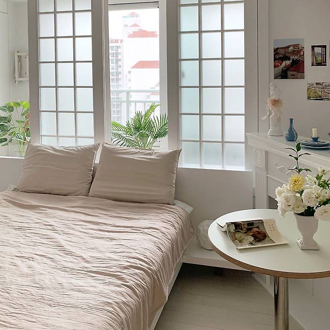 침대 옆 작은 테이블은 제가 취미 생활을 즐기는 곳이에요. 혼자 있을 때나 자기 전에 혼자 책도 읽고, 티타임도 하는 등 소소한 일상을 즐겨요.