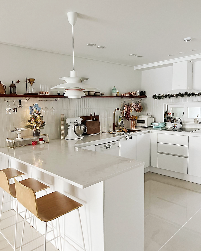 가장 먼저 소개하고 싶은 곳은 주방이에요. ㄱ자 형태로 조리 공간이 부족했던 곳을 'ㄷ자'로 바꾸는 큰 공사를 했거든요. 그 덕에 삶의 질도 많이 높아졌고요. 거기에 상부장을 없앤 뒤 원목 선반을 달았더니 지금의 속 시원한 주방이 되었어요. 리모델링과 인테리어로 가장 빛을 보게 된 공간을 꼽자면, 단연 이곳이 아닌가 싶네요.