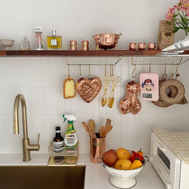 주방엔 제가 사용하는 베이킹 용품이 많아요. 선반 위에 모든 걸 진열하기는 어려워 철제 고리를 활용해 단정하게 정돈했어요.