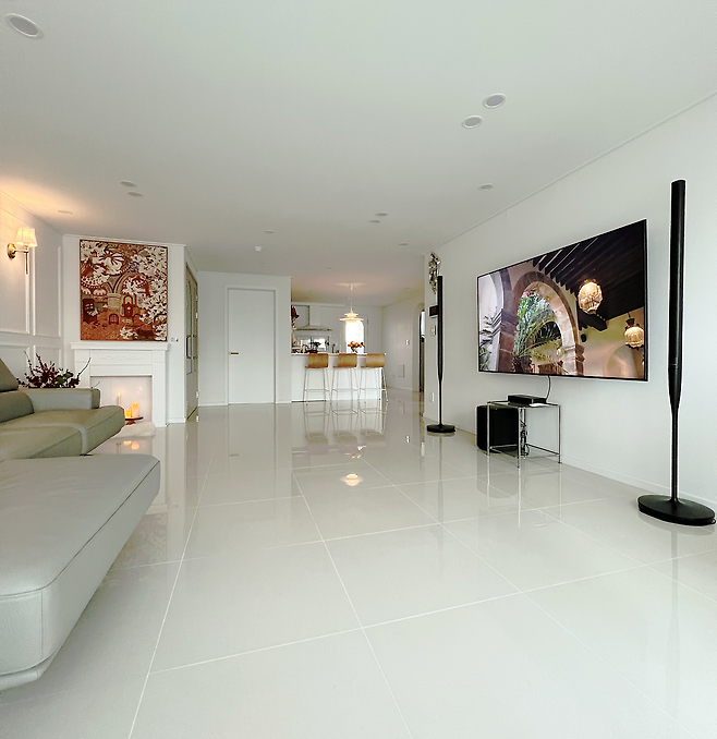 거실 바닥엔 폴리싱 타일을, 벽엔 화이트 벽지와 도장을 섞어서 시공했어요. 시공 전에는 '폴리싱 타일'로 유광 느낌을 낼까, '포셀린 타일'로 무광 느낌을 낼까 고민했지만 역시 폴리싱 타일이 더 고급스럽고 넓어 보이겠더라고요. 그 후로는 망설임 없이 스타일링해나갔죠.