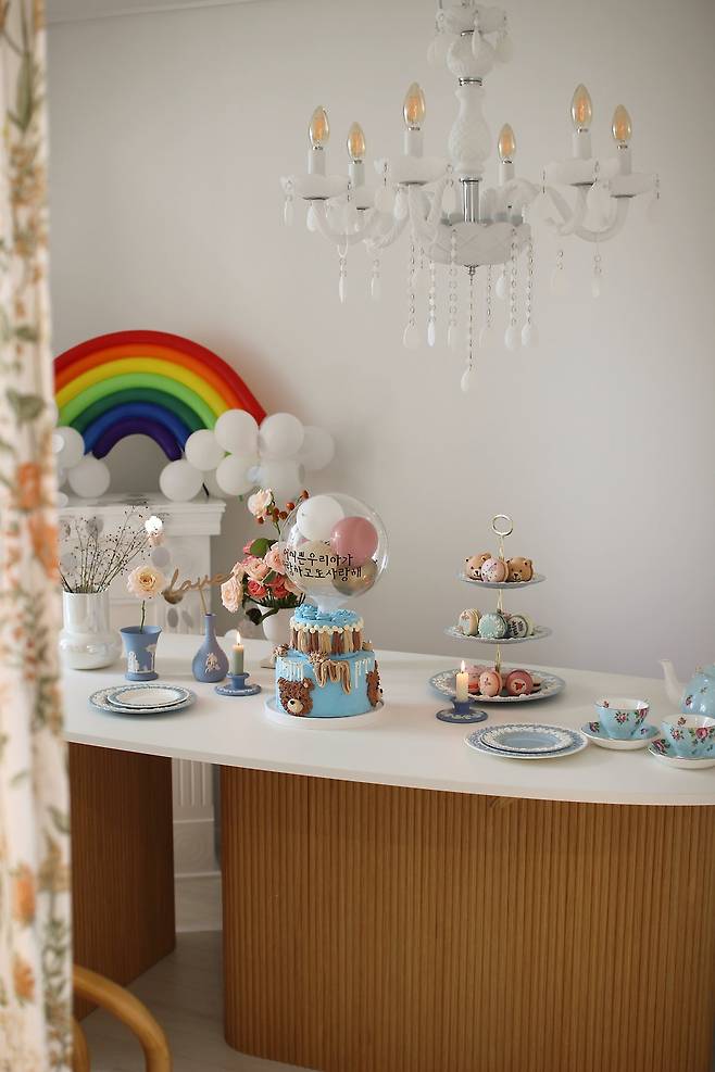 '촤라락' 커튼을 열면 다이닝룸이 펼쳐져요. 처음부터 파티룸으로 사용할 계획이었기에 화이트 마카롱 샹들리에를 달아 특별한 분위기를 주었답니다.