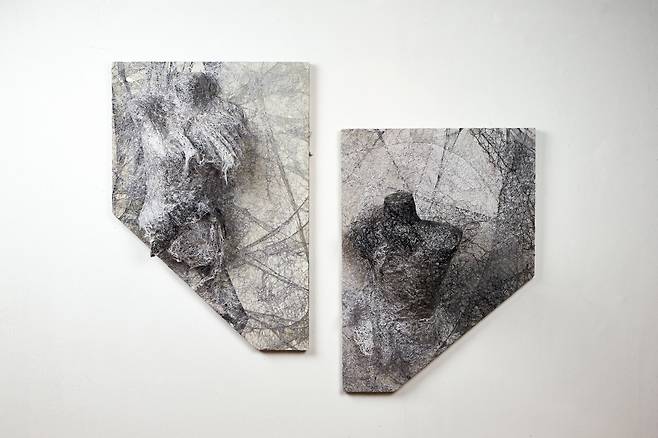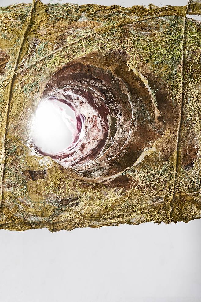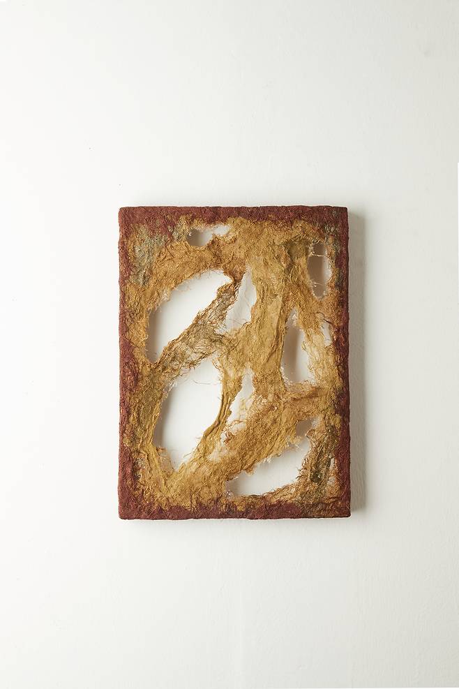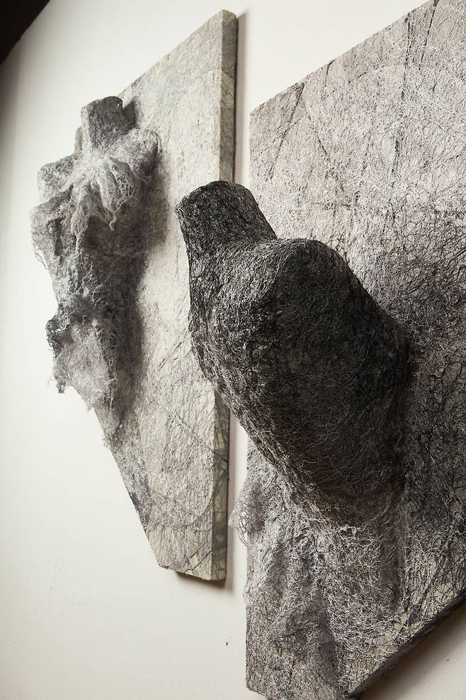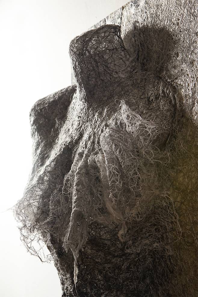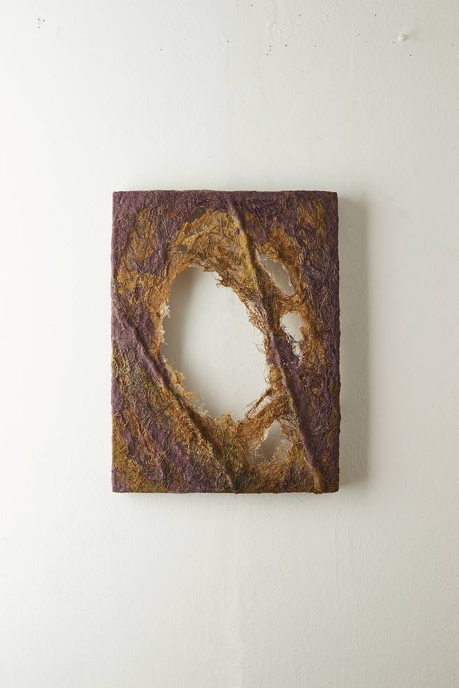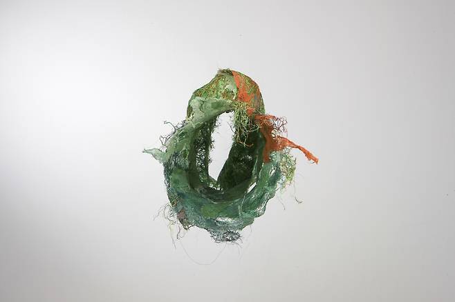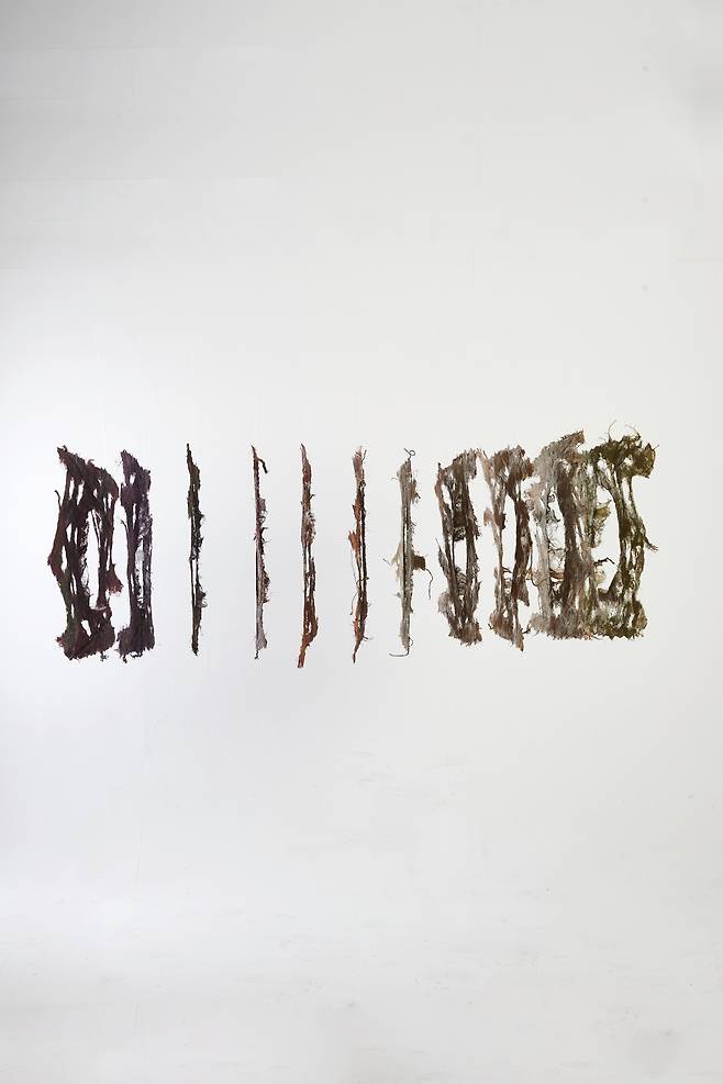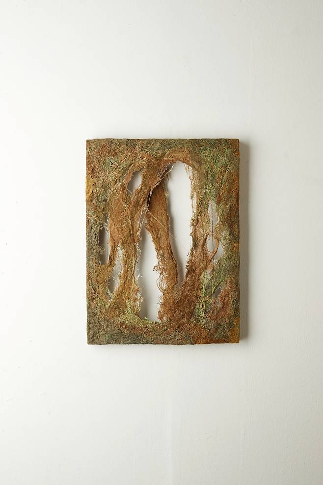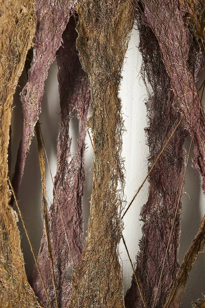 이어진 <Hold>는 시간성을 담은 작품으로, 갈변(褐變)되는 과정 속에서도 자연의 균형을 잡아가는 실루엣을 섬유자체의 특성만으로 포착한다. 불안정함과 허무함 속에서도 죽음을 향해하는 갈변의 과정은 어쩌면 인간이 삶 속에서 느껴야하는 불안함을 덤덤히 받아들이는 표현이 아닐까.