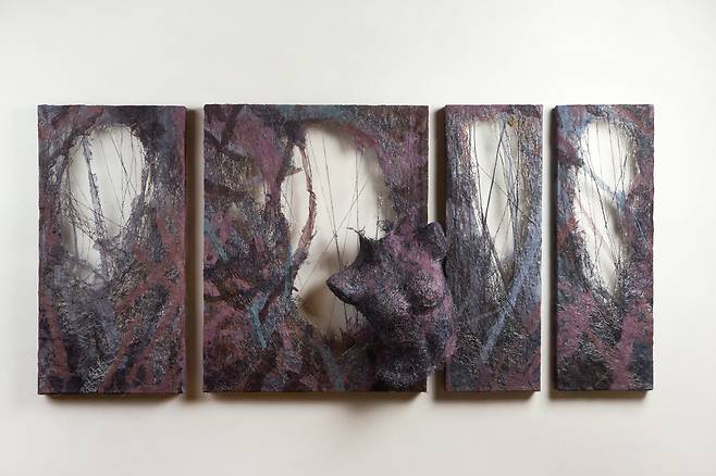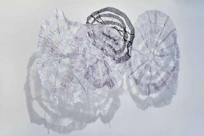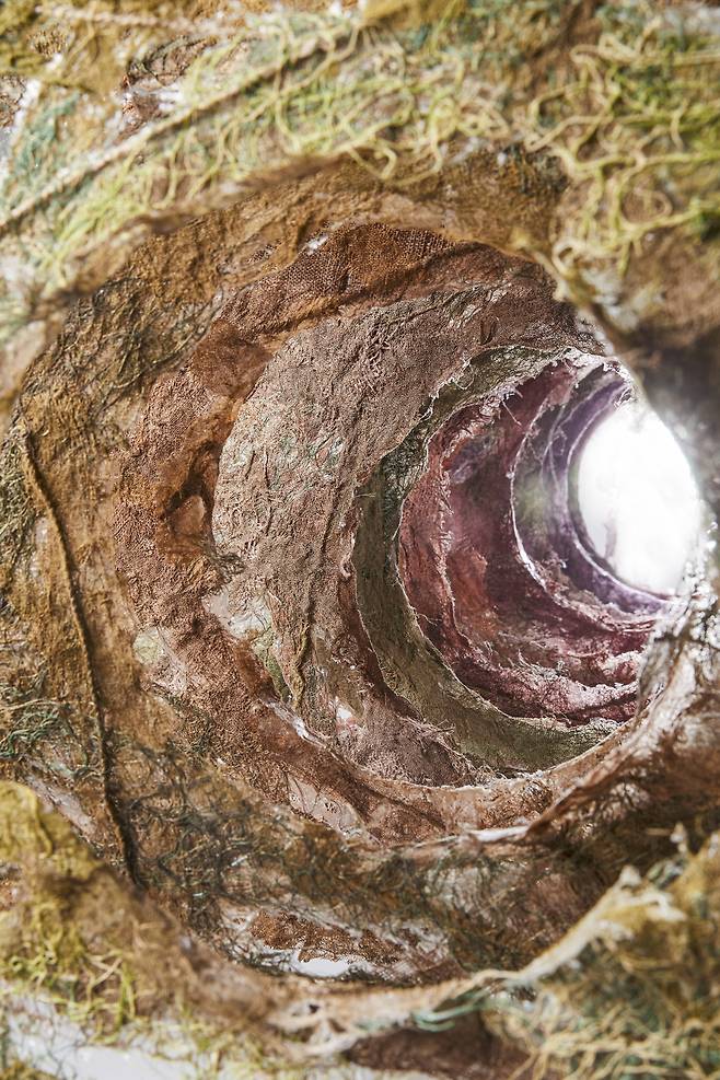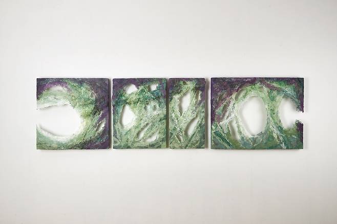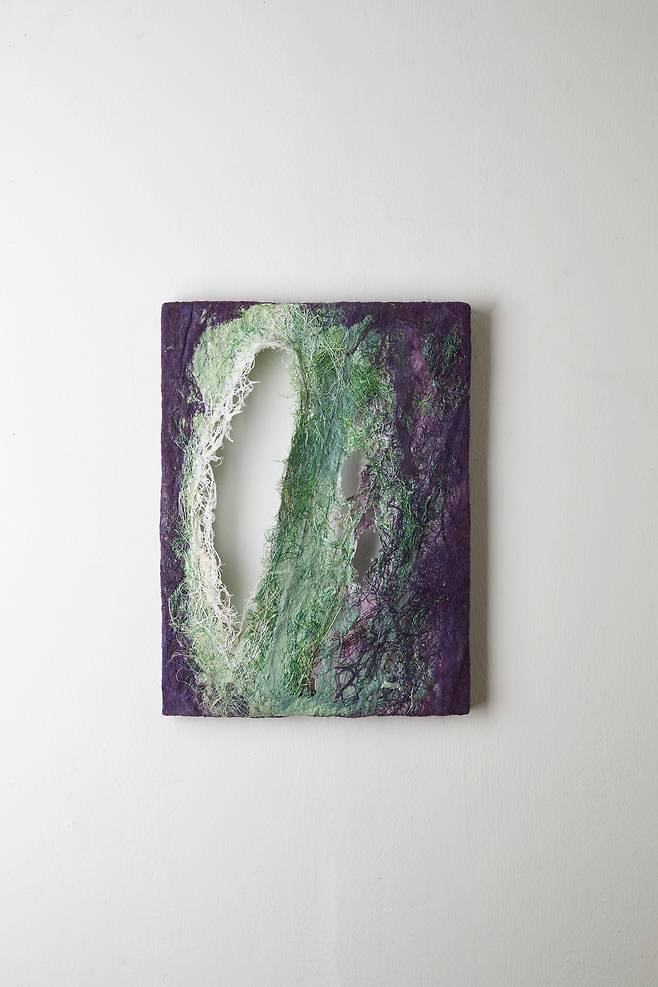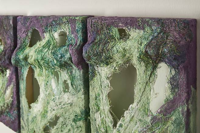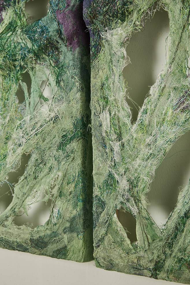 자연이 주는 연대감을 통해 세계와 연결되고자 하는 바람은 《Connection》 전시의 큰 테마이기도 하다. 자연이 살아 숨쉬는 모습을 담은 <Breathe into being>은 초록색과 보라색의 섬유재료를 통해 식물의 순수함을 탐색하고 캔버스 사이가 호환되는 소통을 장을 마련함으로써 ‘생명=숨’이 순환되는 시각을 보여준다.