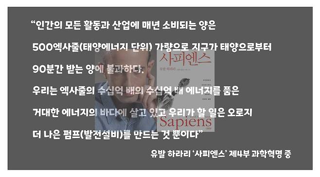 국내 100만부, 세계적으로 2000여 만부가 팔린 슈퍼 베스트셀러 ‘사피엔스’의 저자 유발 하라리는 태양에너지의 무한한 잠재력을 이렇게 서술했다.